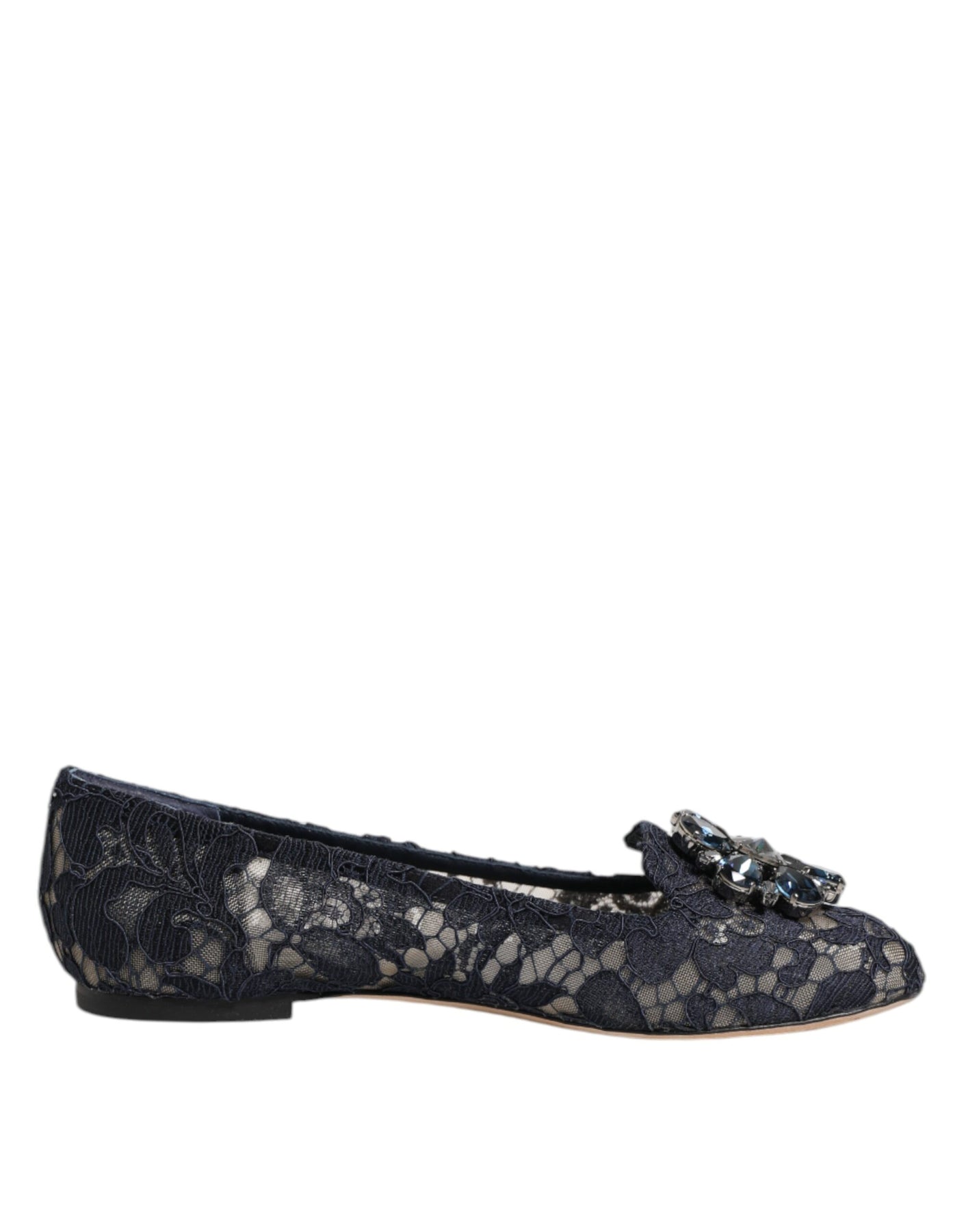 Gorgeous brand new, 100% Authentic Dolce & Gabbana elegant Vally shoes are exquisitely crafted in Italy from the finest Taormina lace. Seen here in dark blue, these pretty floral lace Vally slippers from Dolce & Gabbana will instantly lift your look to new sartorial heights. Featuring an almond toe, a branded leather insole and a wearable flat leather sole, these beauties are finished with a sparkling decorative crystal flower on the front.