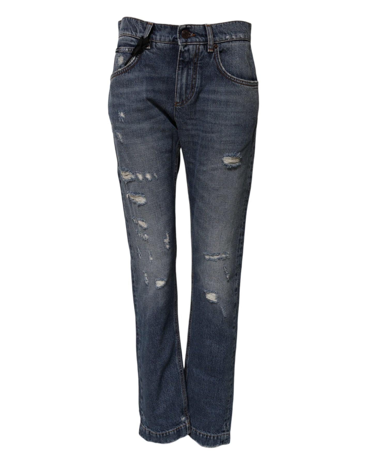 Gorgeous brand new, 100% Authentic Dolce & Gabbana tattered jeans made from cotton blend features a DG sacred heart patch on back pocket with, mid waist and zipper closure.