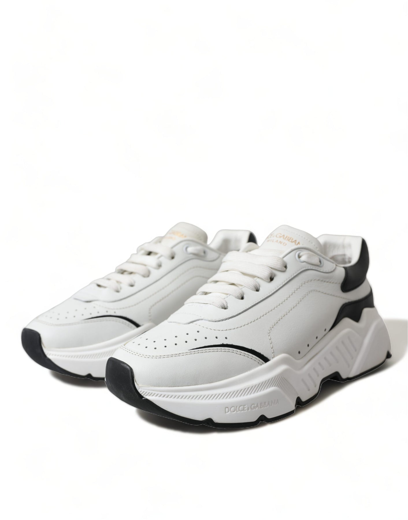 Gorgeous brand new with tags, 100% Authentic Dolce & Gabbana sneakers made of leather, a logo on the outside, a pull tab on the back, a logo patch on the tongue, an almond-shaped nose, a flat rubber sole and laces with logo tape.